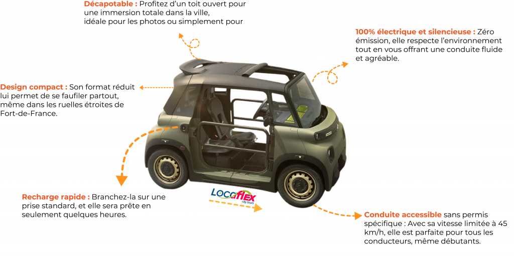 Montez à bord de la Citroën Ami Buggy, une voiture électrique révolutionnaire qui redéfinit le plaisir de conduire en ville. Décapotable, compacte et écologique, l’Ami Buggy est conçue pour vous offrir une expérience de visite fun, pratique et respectueuse de l’environnement. Idéale pour explorer Fort-de-France, elle combine innovation et confort pour rendre chaque trajet inoubliable.
